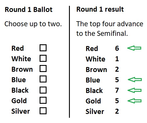 I’ll leave it to you to research these systems if you wish. But a system with a Semifinal and Final on one ballot would be hard to beat, and simple enough for use in the real world.